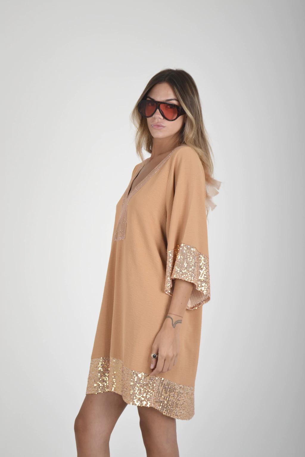 Vestido corto de creppe negro con aplique de red en el cuello y socalo de mangas e inferior de lentejuelas. Un modelito super amplio, comodo y fresco para el verano!