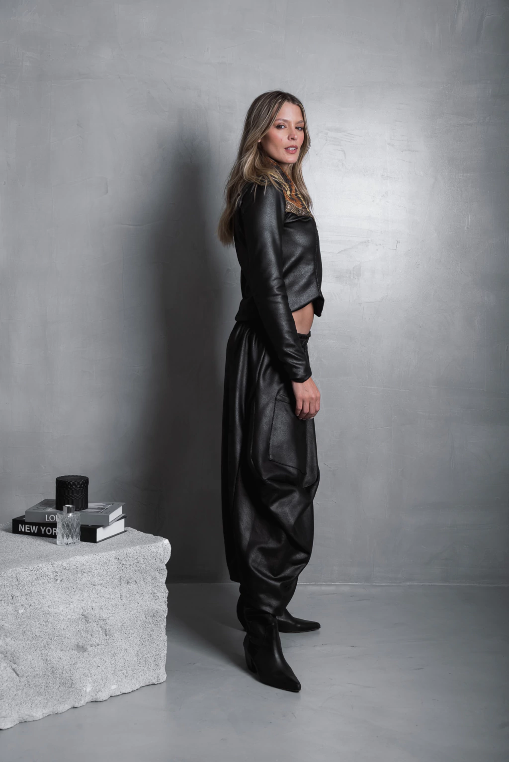 El Pantalón Cóndor es la prenda ideal para quienes buscan un estilo moderno. Está confeccionado en cuero croco negro. Su corte bombe ofrece comodidad y libertad de movimiento, cuenta con prácticos bolsillos externos e internos al costado, combinando funcionalidad y diseño. Perfecto para armar looks urbanos o formales con un toque de distinción.