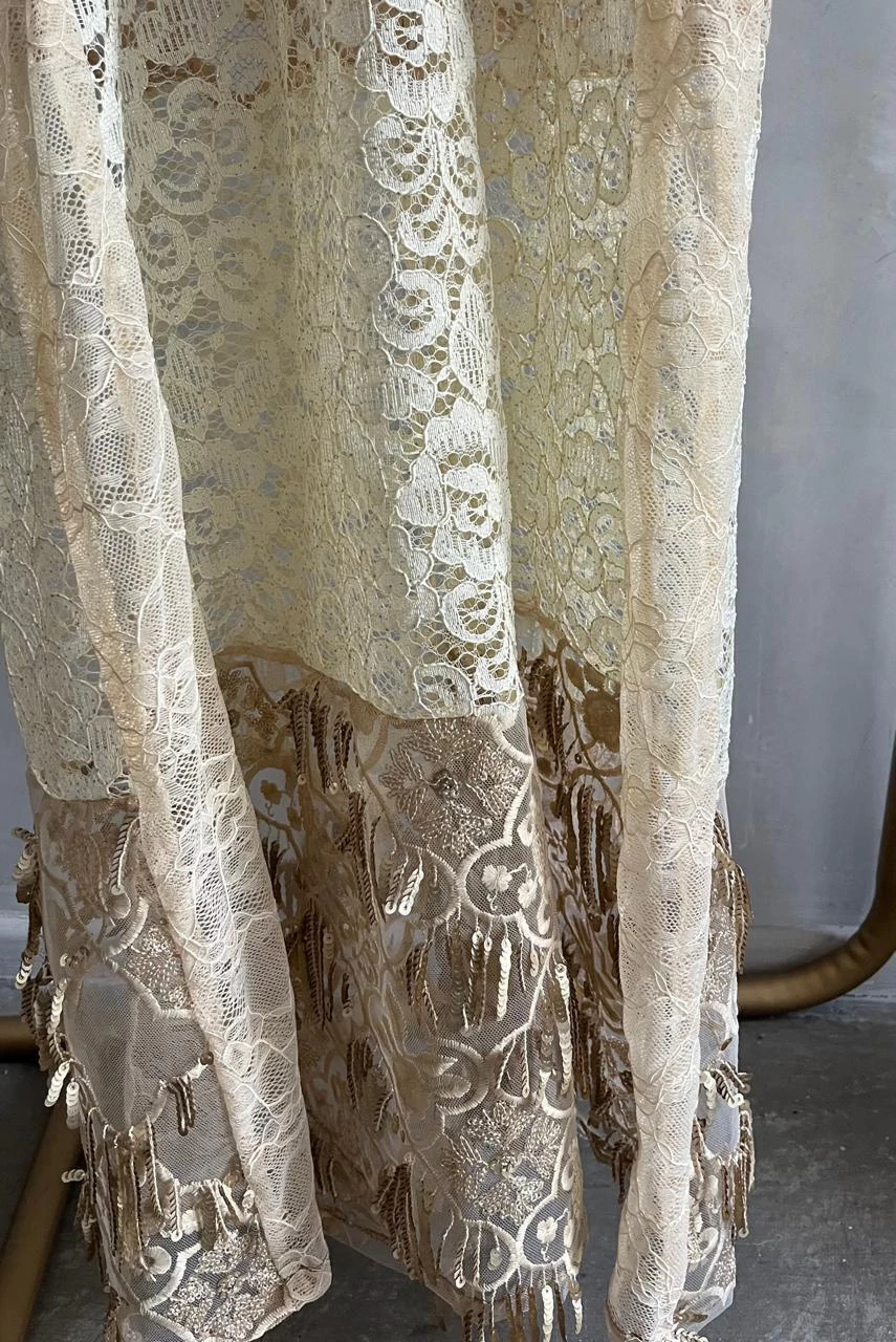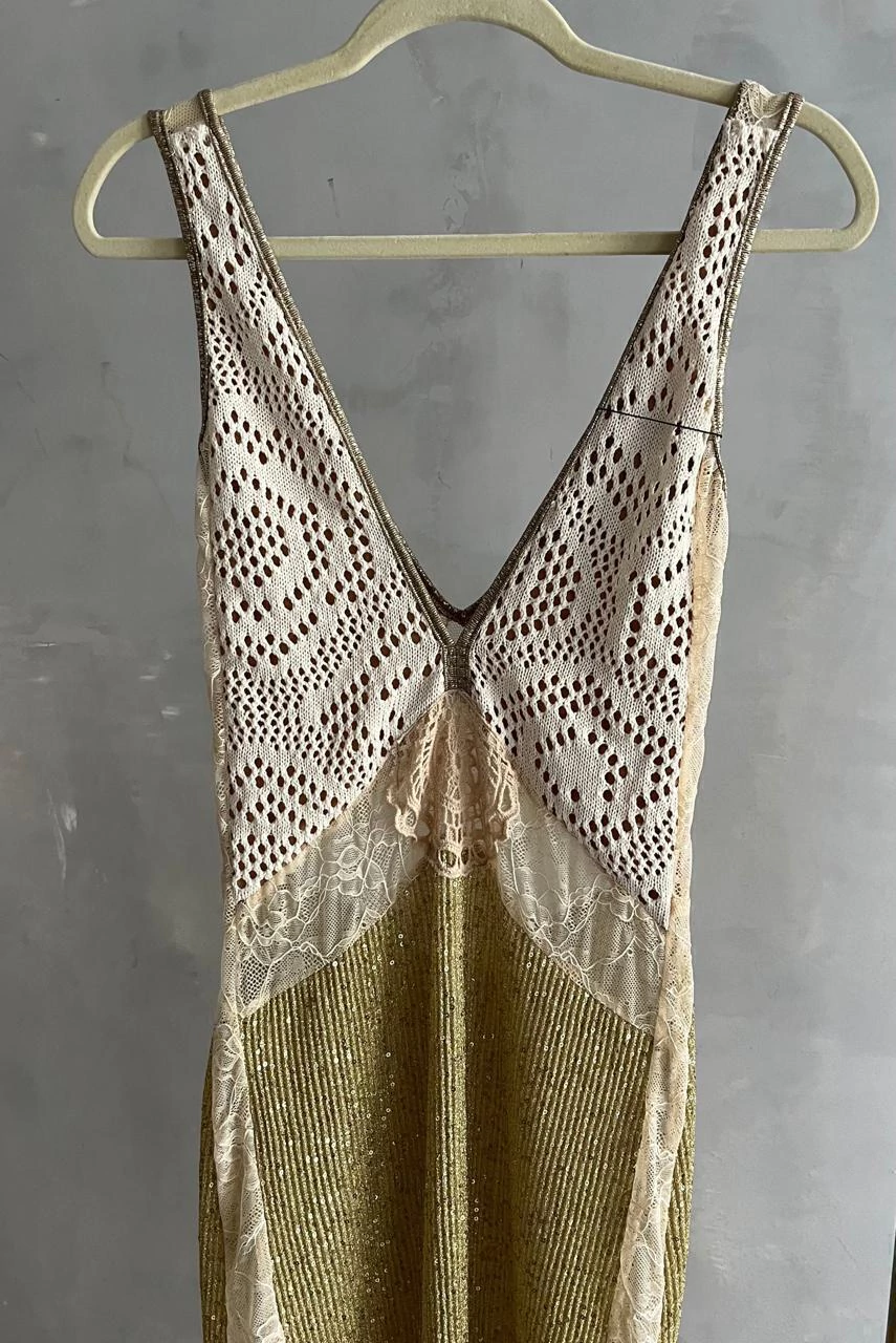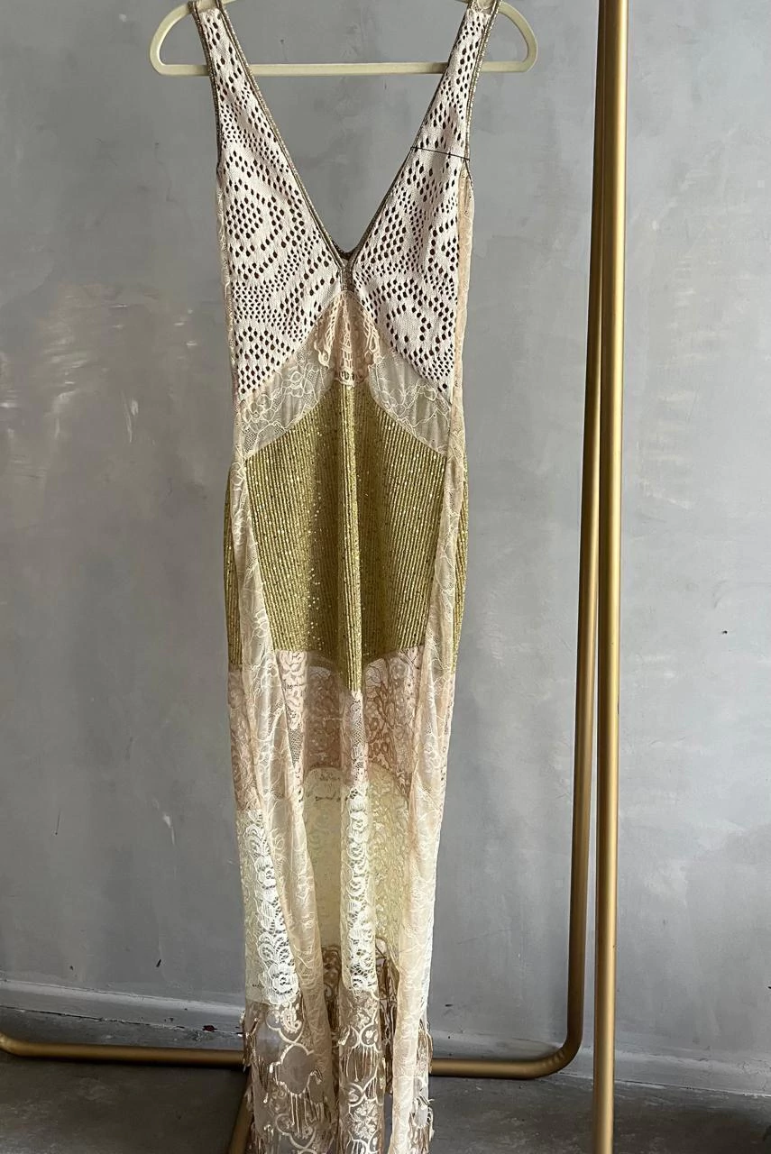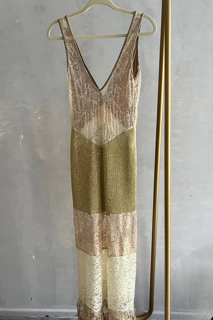 Vestido artesanal color Dorado, con combinacion de textiles, lentejuelas, encajes y puntillas al tono. Es un modelito al cuerpo y se adapta a varios cuerpos ya que elastiza un monton. El indicado para destacar y brillar!