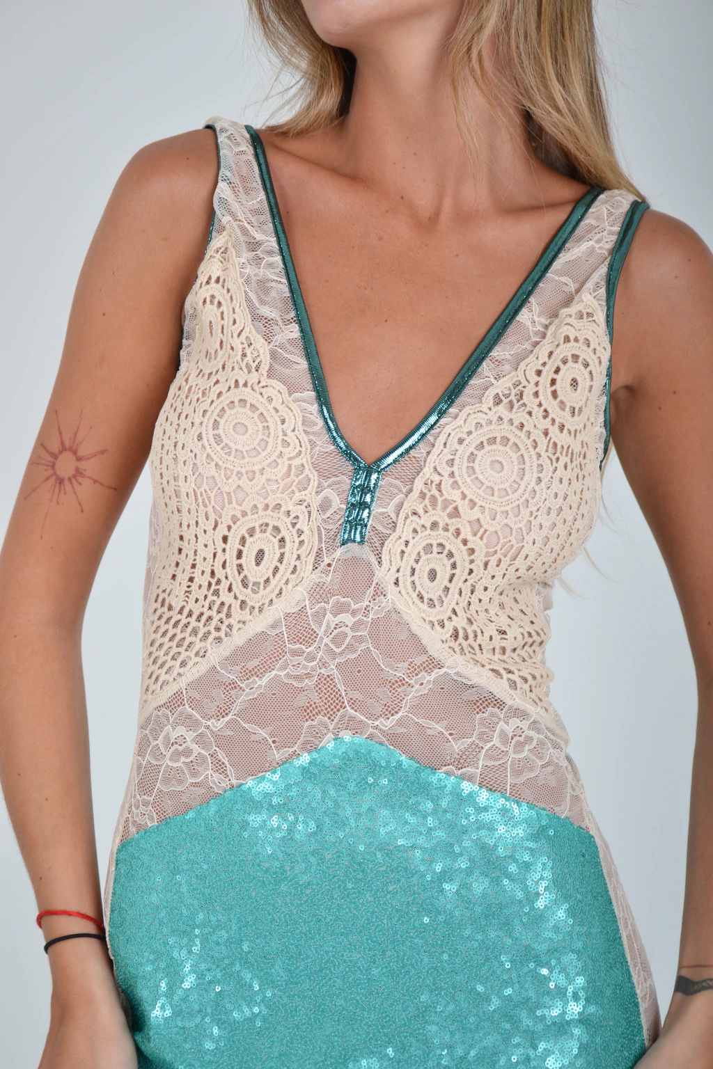 Vestido corto de lentejuelas color Aqua y encaje, con detalle de aplique en el busto. Un modelito super comodo e ideal para un evento!